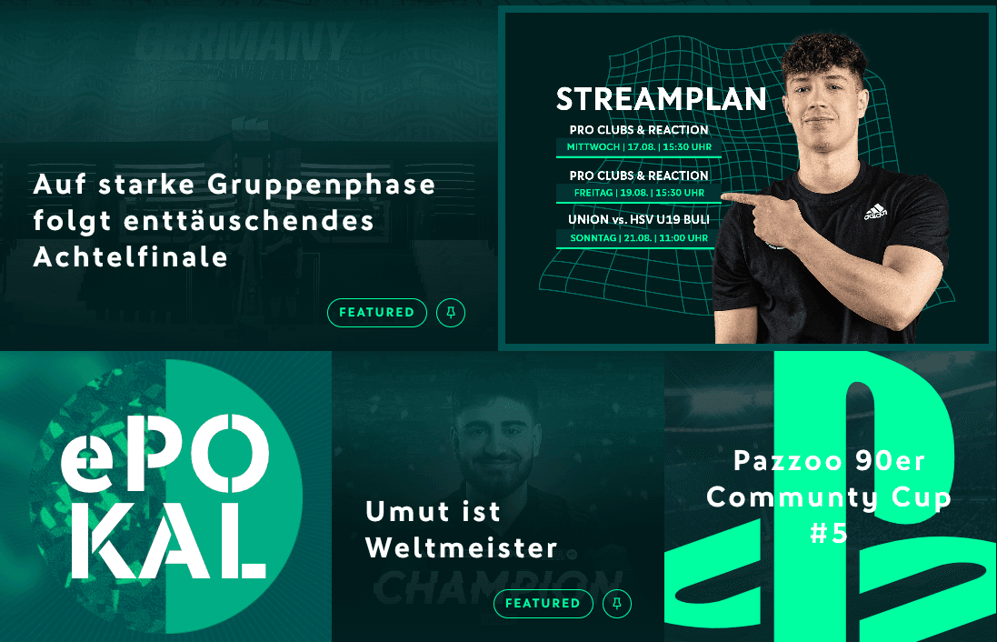 Еще один фокус платформы был сосредоточен на сообществе и информационном аспекте. Пользовательские страницы предоставляют возможность свободно настраивать отдельные страницы. Они используются для максимально простого объяснения пользователям правил и процессов конкуренции. Раздел "Новости" удовлетворяет множество потребностей. С одной стороны, статьи используются для сообщения об обновлениях в процессе игры, с другой стороны, это центр для немецкого сообщества eFootball, чтобы информировать себя, а также обмениваться информацией с единомышленниками в модулях взаимодействия.