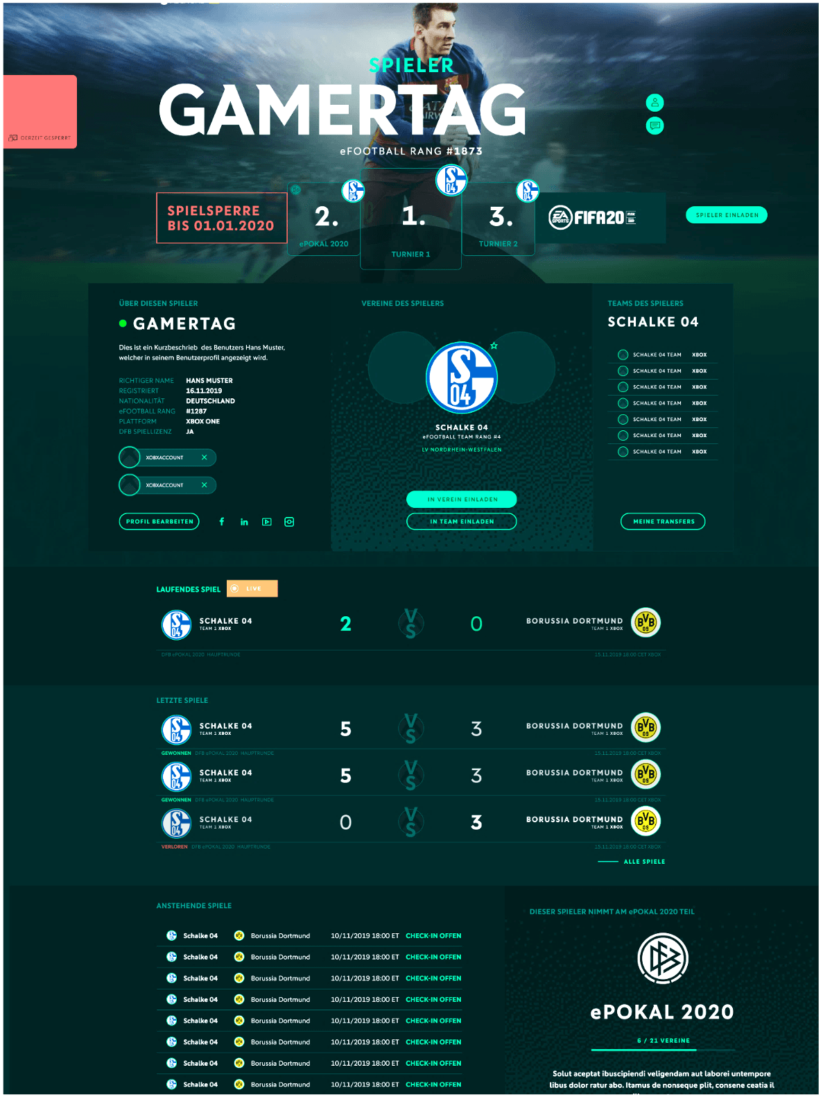 Наш клиент столкнулся с проблемой интеграции футбольных симуляторов (FIFA и PES на обеих консолях PS4 и Xbox One) в свою существующую экосистему. С помощью TES была заложена основа для футбола как дополнительной ценности для действующих футбольных клубов. Платформа теперь является цифровым домом немецкой экосистемы eFootball, включая интегрированные трансляции, все мероприятия национальных команд DFB, точку контакта для получения текущего контента eFootball и многое другое.